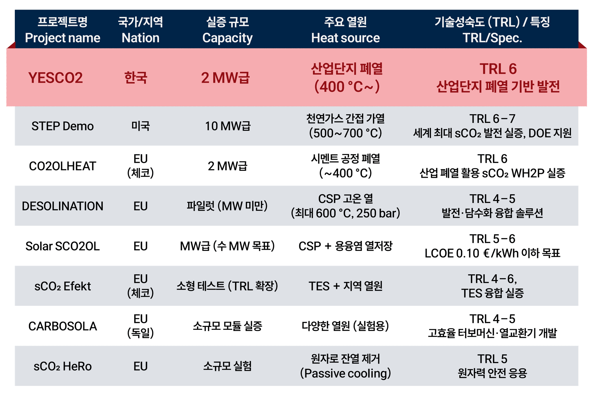 EU Horizon 2020 프로그램의 지원을 받는 CO2OLHEAT 프로젝트는 체코의 CEMEX 시멘트 공장에서 2 MW급 폐열 기반 sCO₂ 발전 시스템을 실증하고 있습니다. 약 400 °C 수준의 산업 폐열을 전력으로 전환하여, 시멘트 산업과 같은 에너지 다소비 업종의 탈탄소화를 지원합니다. 또한 모듈형 설계를 통해 다른 산업단지에도 쉽게 적용 가능하도록 확장성을 확보하고 있습니다. 이 프로젝트는 ‘산업 폐열 → 전력’ 전환 기술을 유럽 전역에 보급하는 선도적 모델로 자리매김하고 있습니다.