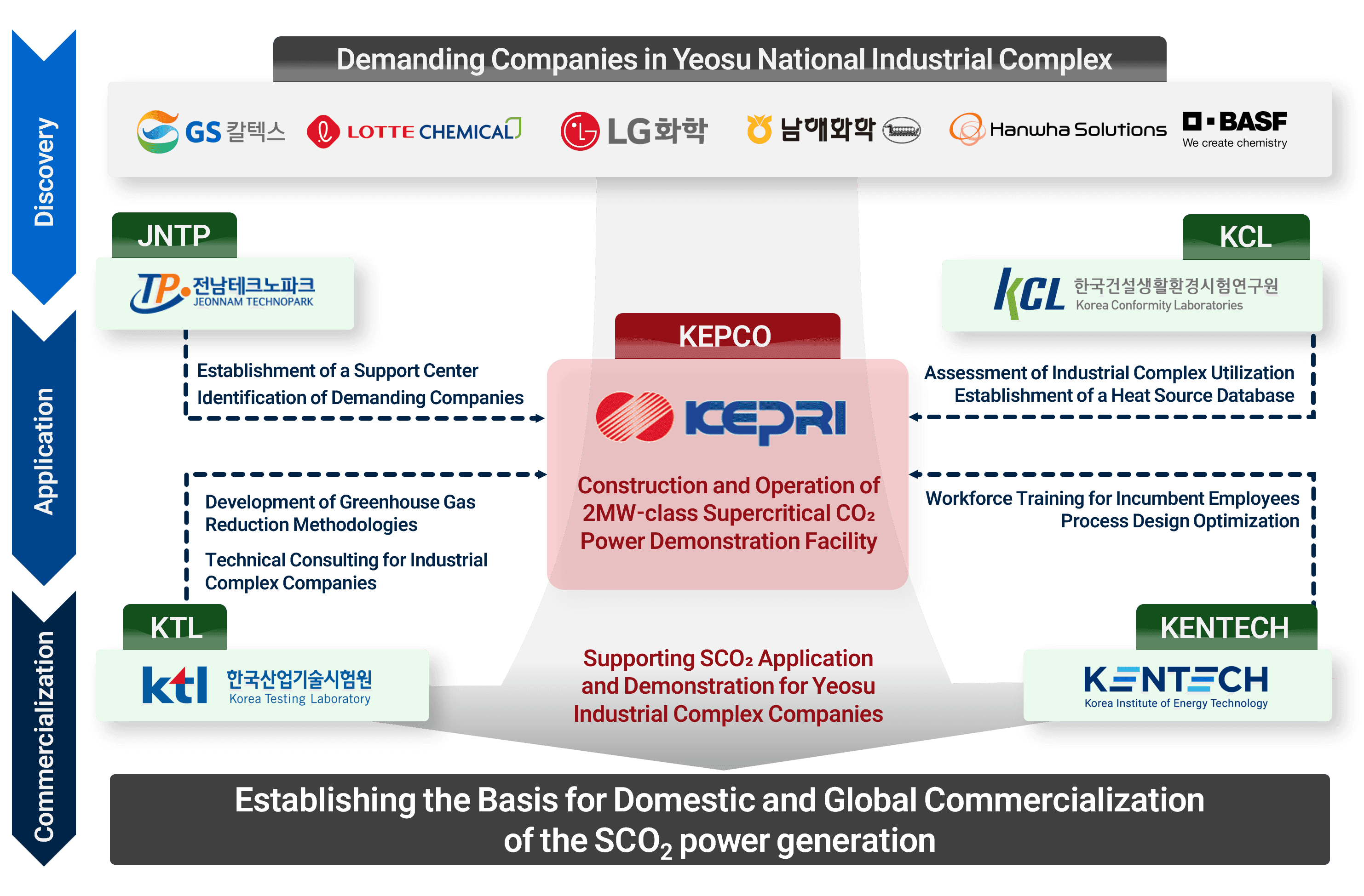 As the lead organization, KEPCO manages the construction, operation, control, and optimization of the supercritical CO₂ power demonstration facility. KEPCO designs supercritical CO₂ power cycles that simulate industrial complex waste heat sources and establishes the demonstration facility to secure system reliability.